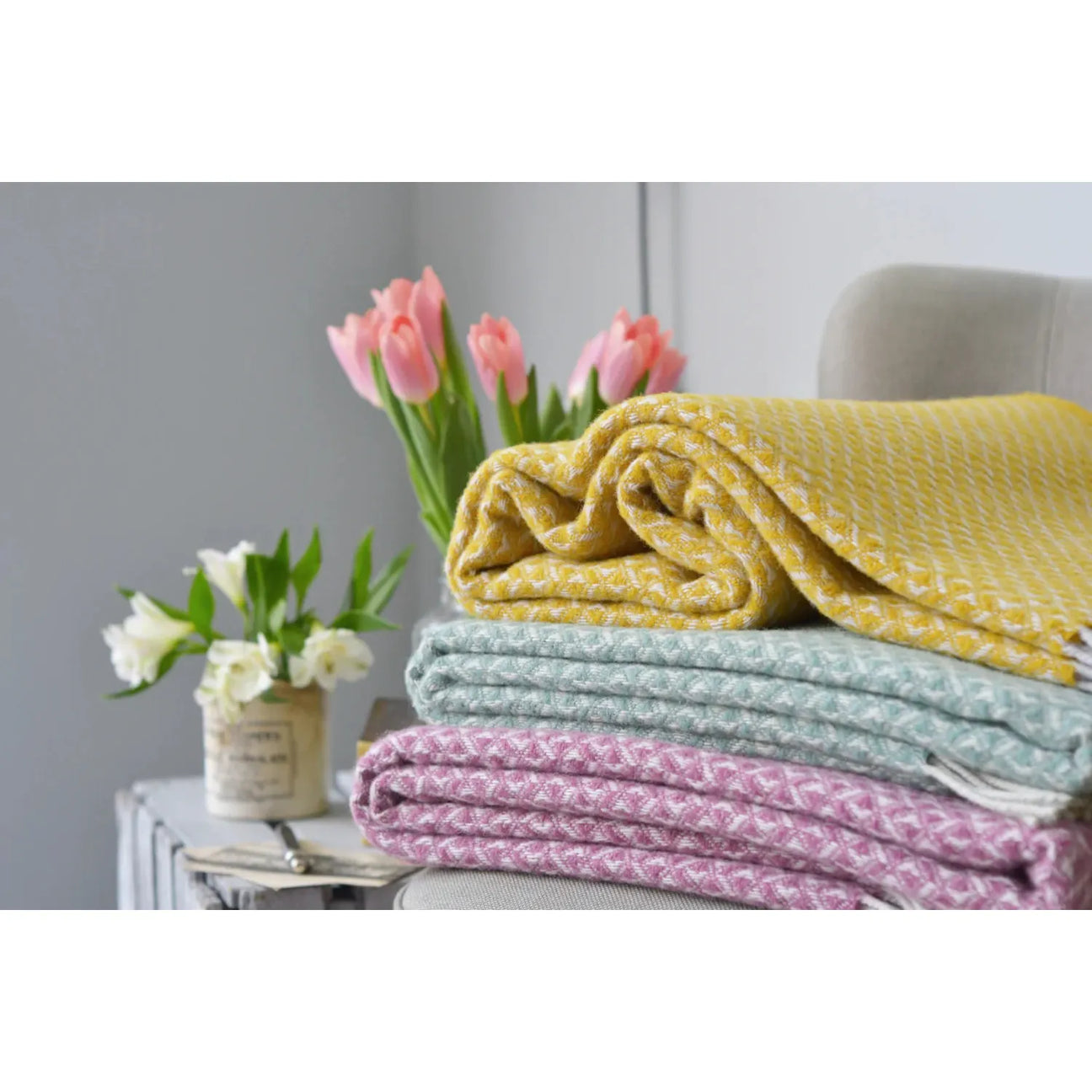Yellow 100% Pure New Wool Diamond Throw Blanket (183cm x 140cm)