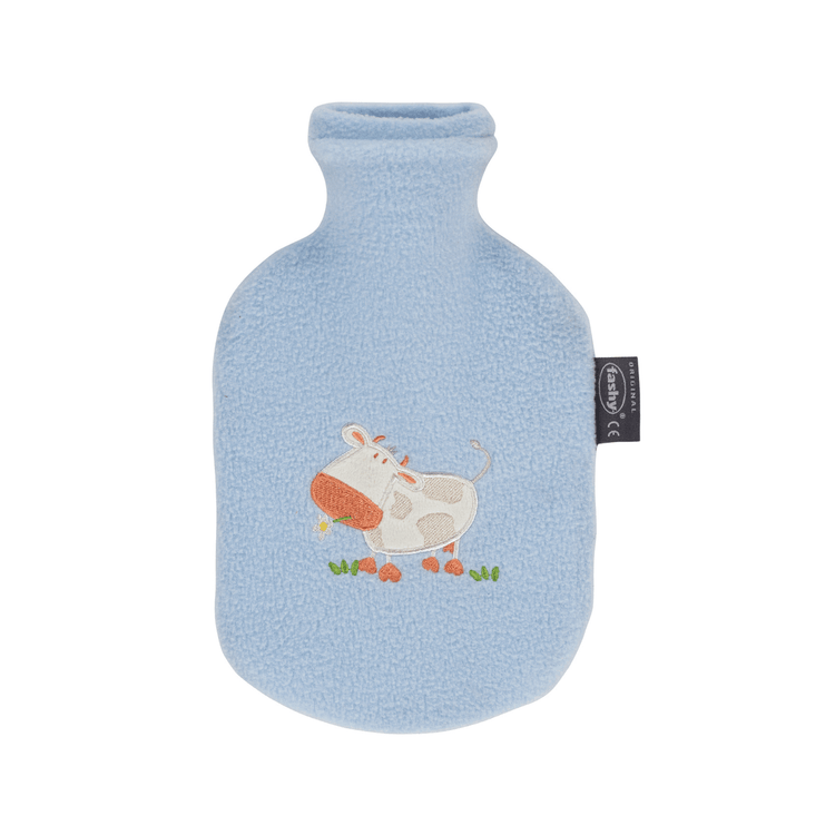 Introducing the 0.8 litre Fashy hot water bottle with blue fleece cover featuring an embroidered sheep - the perfect blend of warmth, style, and eco-friendliness. This hot water bottle comes with a charming blue sheep fleece cover, adding a touch of cuteness to your comfort routine.