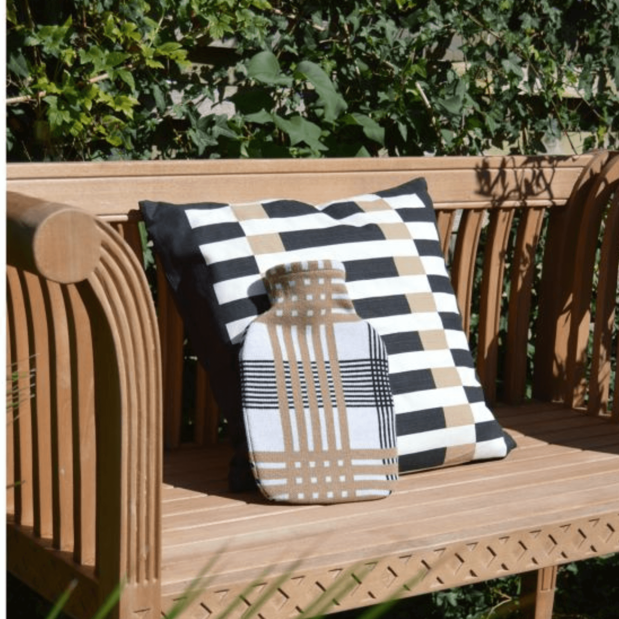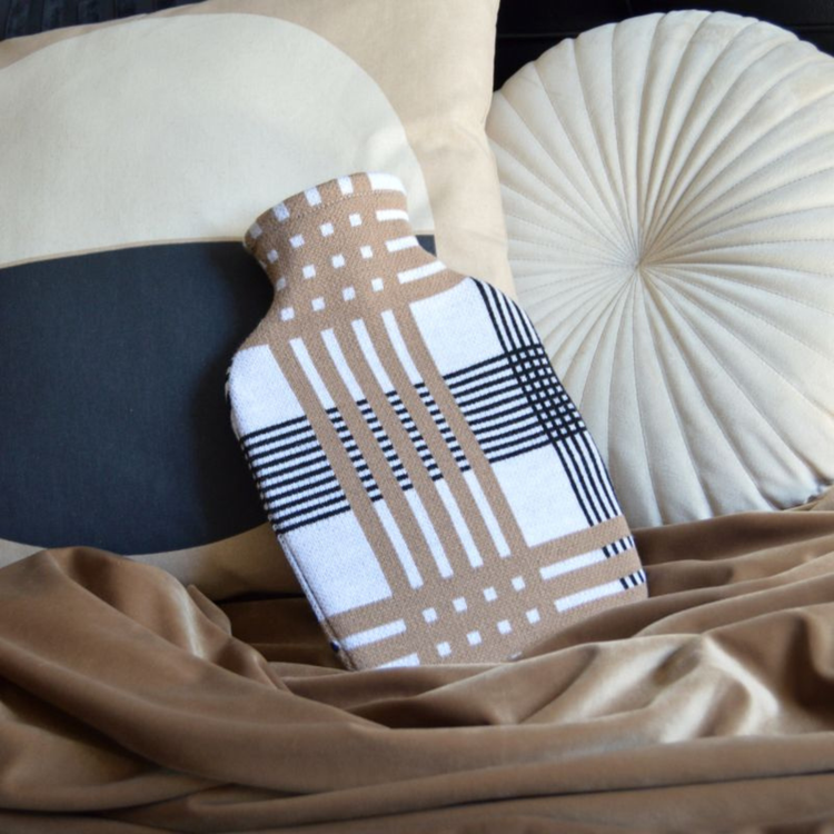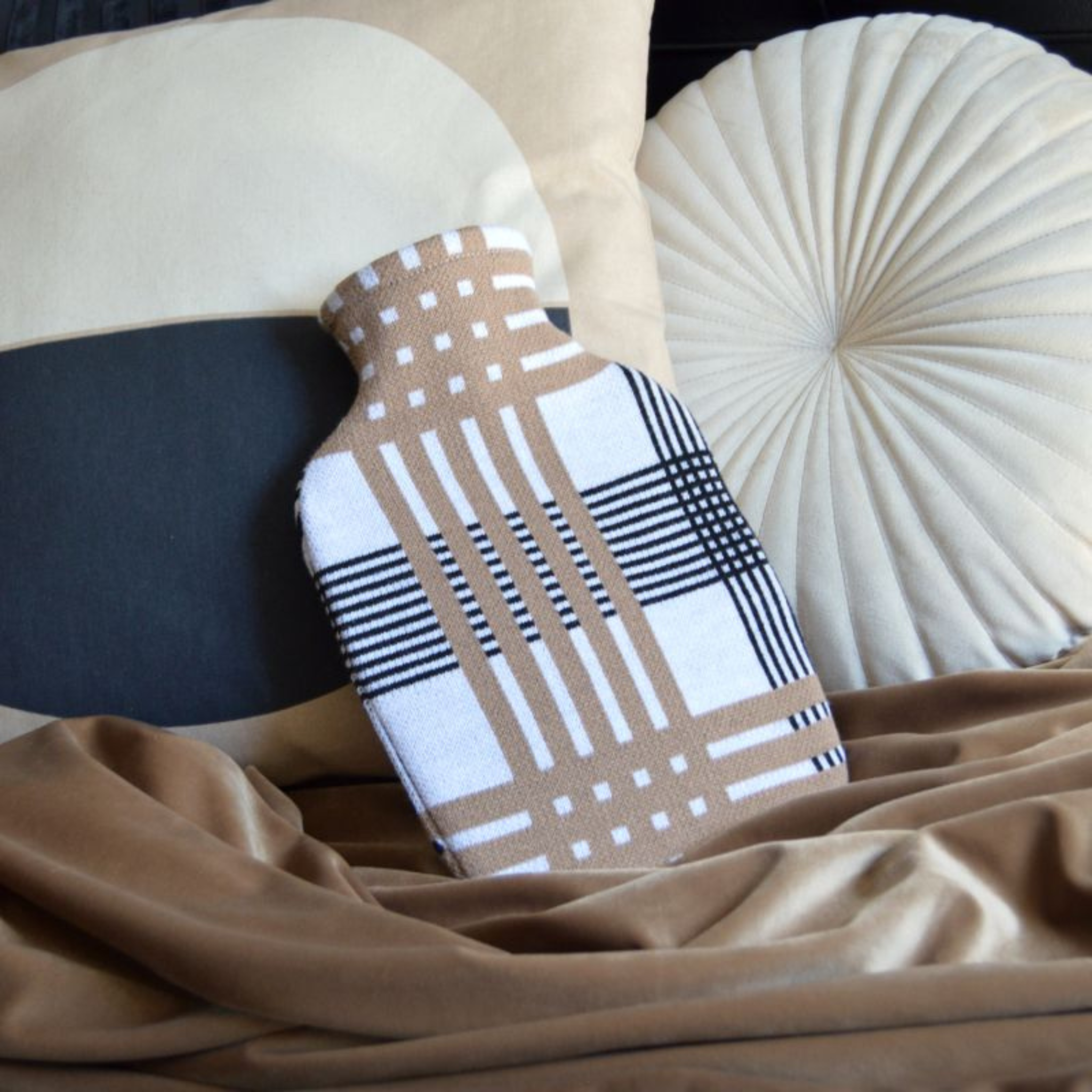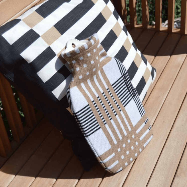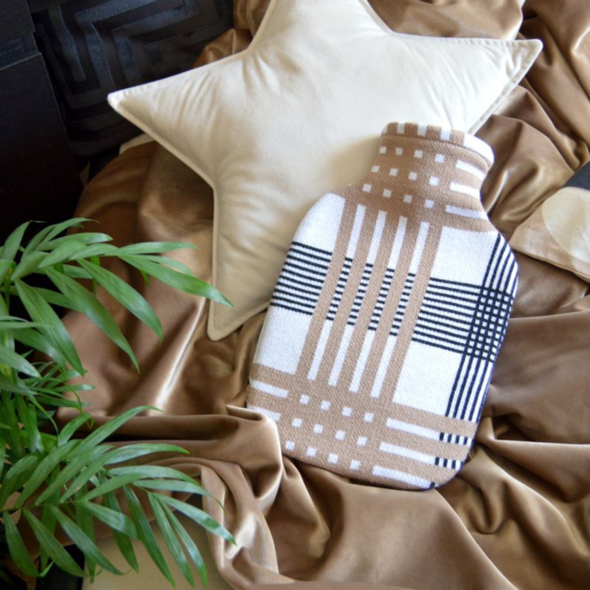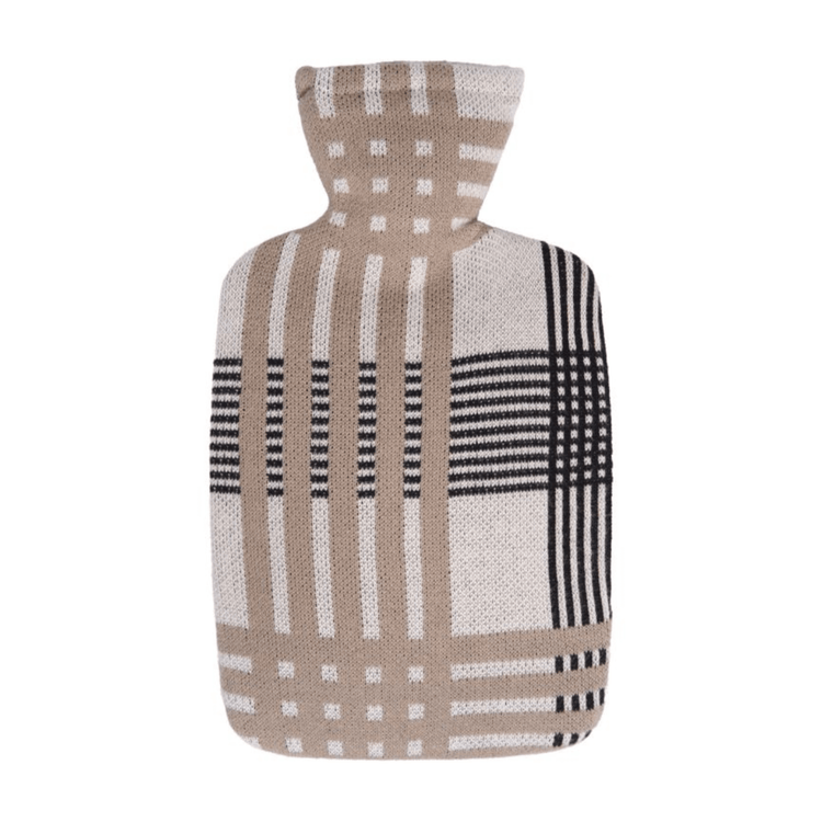 1.8 Litre Classic Plant Based Hot Water Bottle with Beige Check Knitted Organic Cotton Cover (rubberless)
