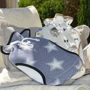 The outer cover features a dog print design. It is made from alpine fleece which provides a soft comfortable feel whilst insulating the heat. The outer cover has pockets perfect to slip your hands in and the cover can be safely separated from the inner bottle. The cover can be washed at 30 degrees.