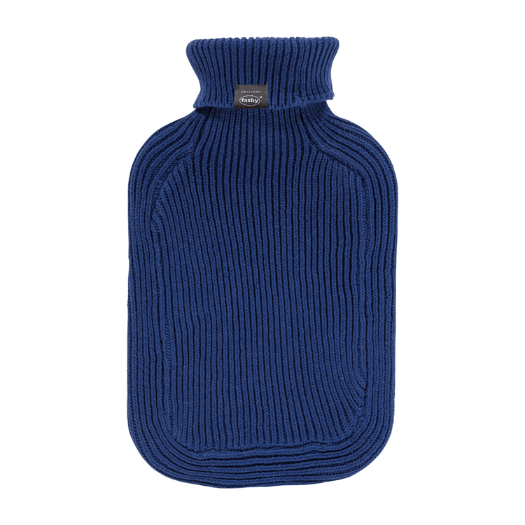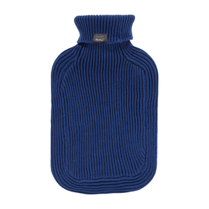 - 2 Litre fashy hot water bottle with a knitted marine blue turtle neck 100% cotton cover